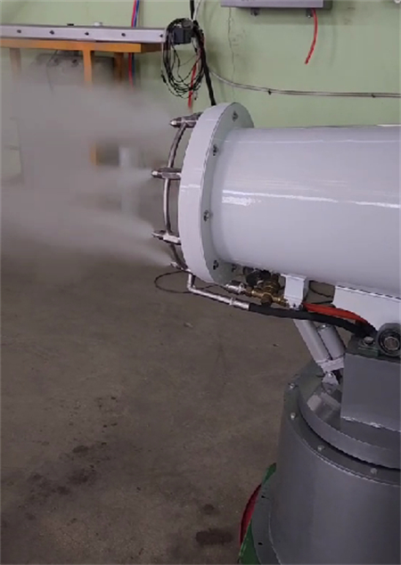 1、霧炮機的除塵效果與噴霧顆粒直徑是有密切關(guān)系的,而在這里其中,干霧霧炮的靈魂部件是噴嘴,將水霧化成適合的降塵水霧顆粒,從而加 快降塵速度,使得噴灑均勻