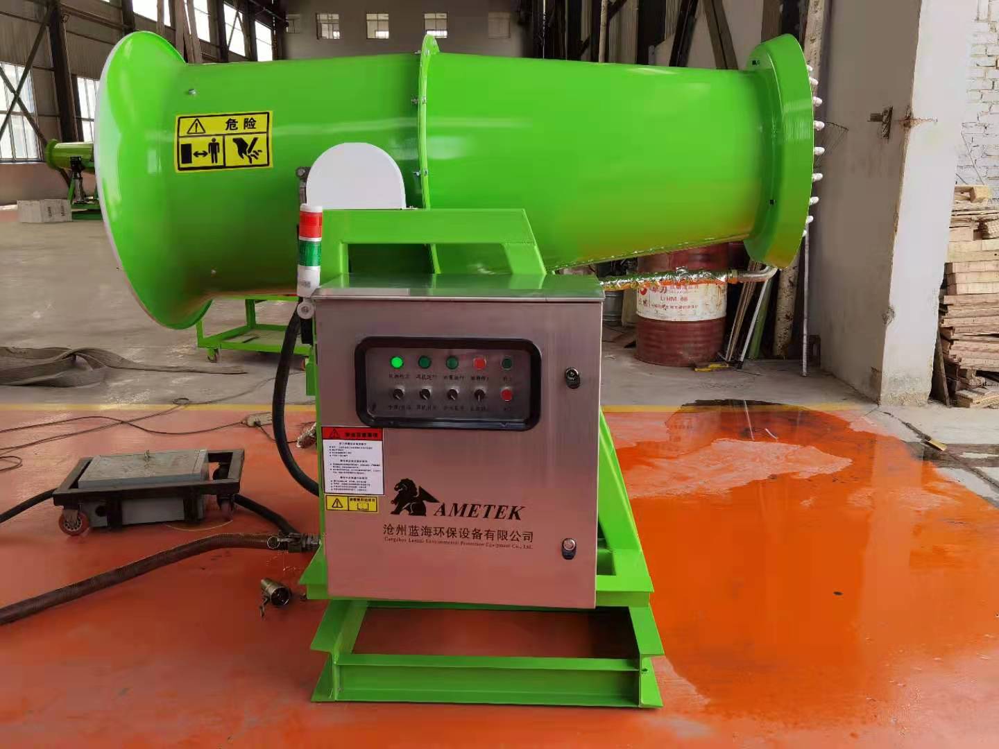 霧炮機生產(chǎn)廠(chǎng)家是根據風(fēng)送原理,先使用高壓泵、微細霧化噴嘴將水化,再利用風(fēng)機風(fēng)量和風(fēng)壓將霧化后的水霧送到較遠距離,使得水霧到達較遠距離同時(shí)能夠覆蓋 大面積,水霧與粉塵凝結后降落,從而達到降塵目的。 霧炮機對容易引起塵埃的堆場(chǎng)噴霧時(shí),噴出的霧粒細小,與飄起的塵埃接觸時(shí),形成一種潮濕霧狀粒,能快速將塵埃抑制沉降。 配套動(dòng)力靈活,即可用380V的市電,也可配套發(fā)電機組供電??砂惭b在混凝土平臺或鋼架平臺上,也可安裝在運輸車(chē)輛上。操作 ,進(jìn)口遙控器100米距離內精 準操控,遠程電腦監控。功力強、射程遠、覆蓋范圍廣,可以實(shí)現定量、定時(shí)噴霧;工作效率高、噴霧速度快。耗水量相比其他抑塵噴灑設備可節約70%~80%(噴淋?chē)姌?、灑水機車(chē)),且水霧覆蓋面積遠大于其他噴灑設備。